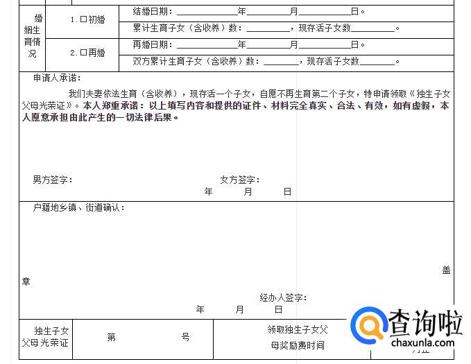 《独生子女父母光荣证》申请书盖章