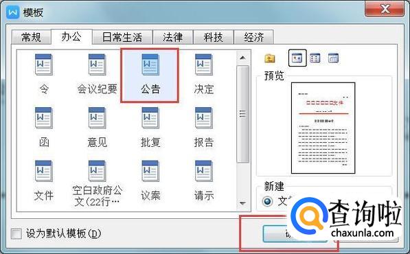 在接下来展开的文件中,我们可以选择通知、公告或者说会议纪要等选项,然后点击“确定”按钮。