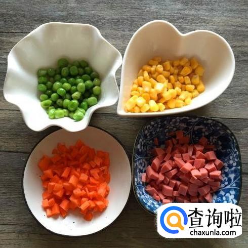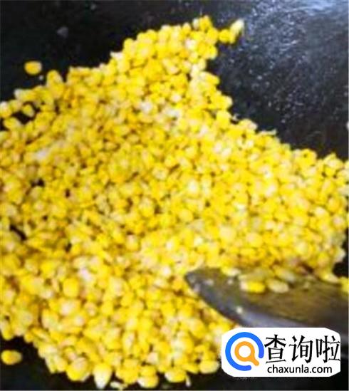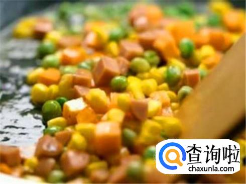 锅里重新倒一点点油,把青豆胡萝卜和腊肉丁(火腿丁)放进去炒熟,将玉米粒倒进锅里,加上一点点食盐与蚝油,撒点葱花就可以出锅。