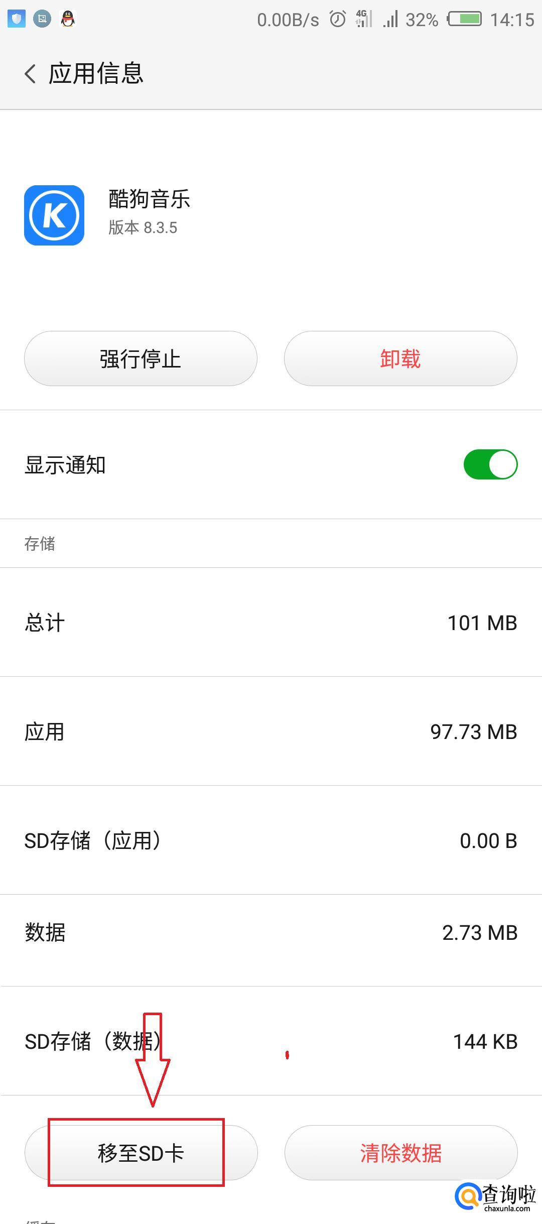 打开后点击想要移动的应用程序,然后在应用信息页面下拉我们可以看到移至SD卡这一个选项,点击即可进行手机软件位置移动。