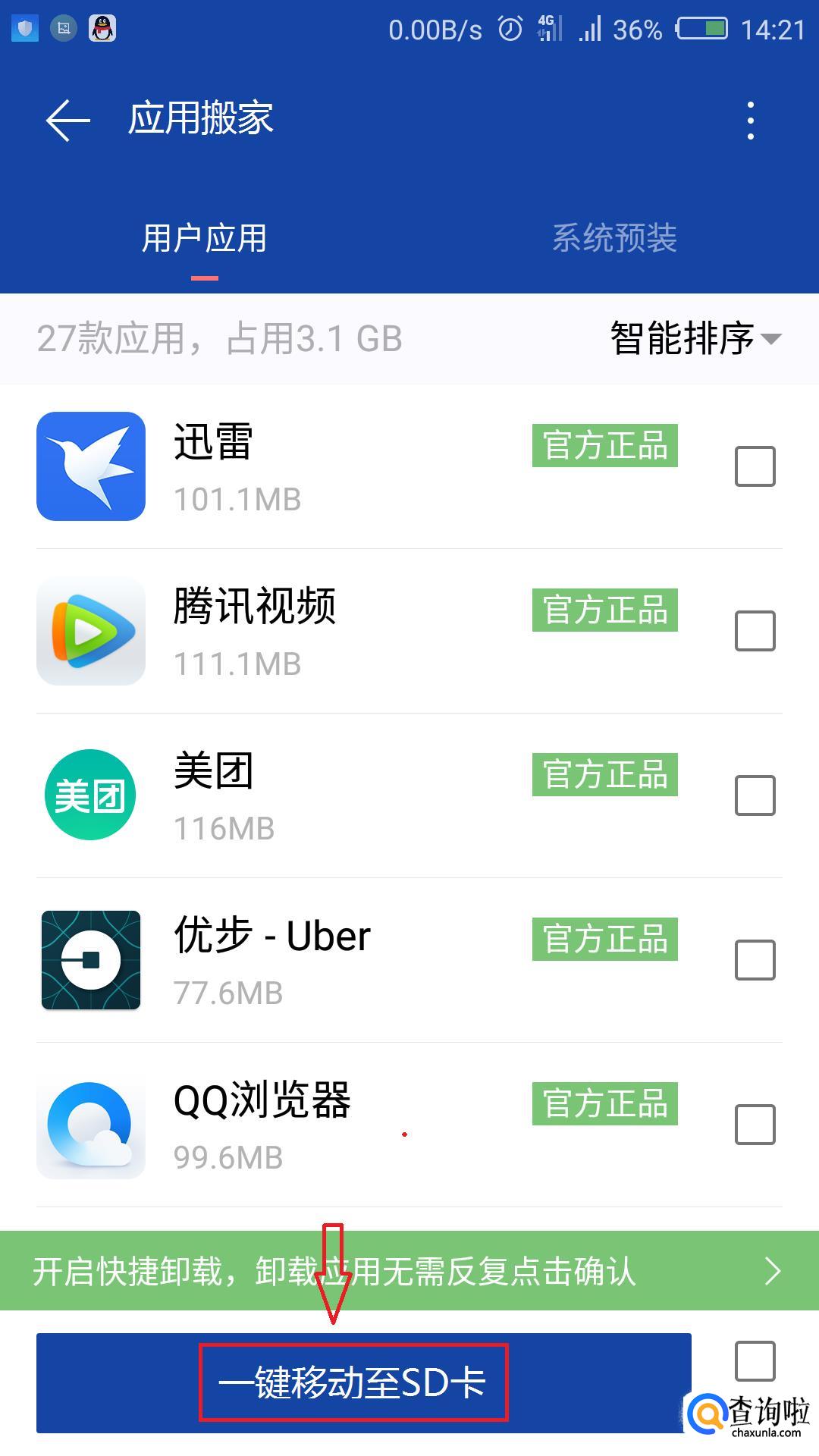 进入应用搬家之后,选择想要移动的手机软件,然后点击 一键移动至SD卡,即可完成手机软件位置移动。