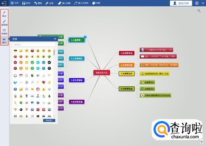 软件的左侧可以天机图片、多媒体、超链接、备注、表情包等选项;