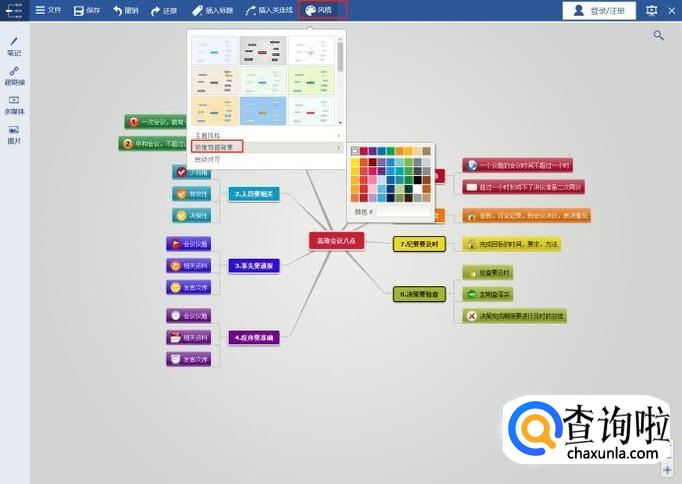 点击软件上方“风格”按钮即可编辑思维导图的整体风格和背景颜色;