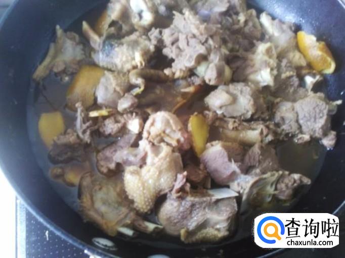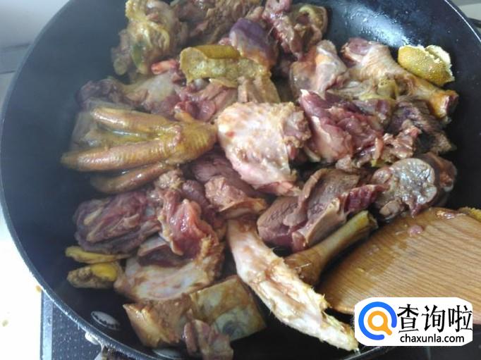 开火下油,把腌好的鹅肉放到锅里翻炒1分钟。