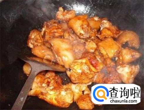 热锅下油,放入姜蒜煸香,然后倒入清洗干净的猪脚,加入适量的老抽上色,翻炒5分钟左右。