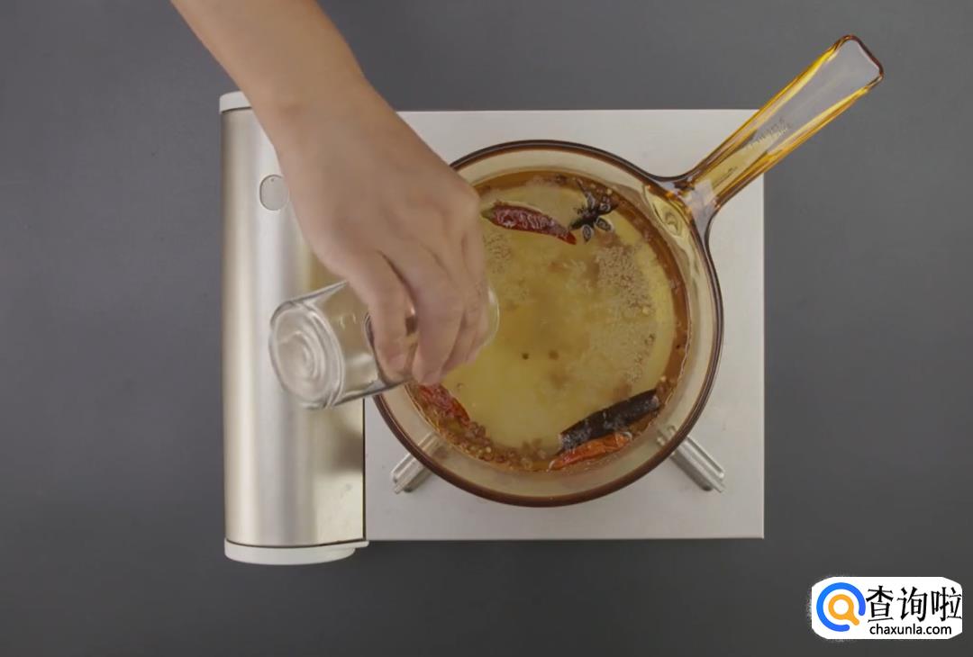 沸水中加入桂皮、八角、花椒、干辣椒,煮沸后关火加盐,制作饱和盐水,有晶体析出或者盐不再溶解为止。