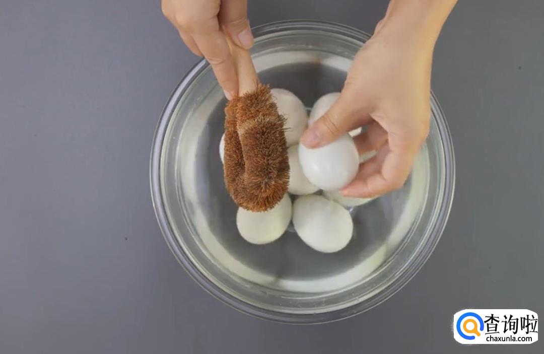 先用刷子将鸭蛋的表面刷干净。
