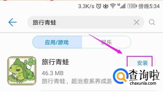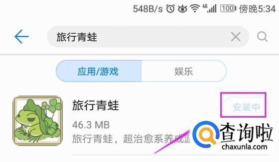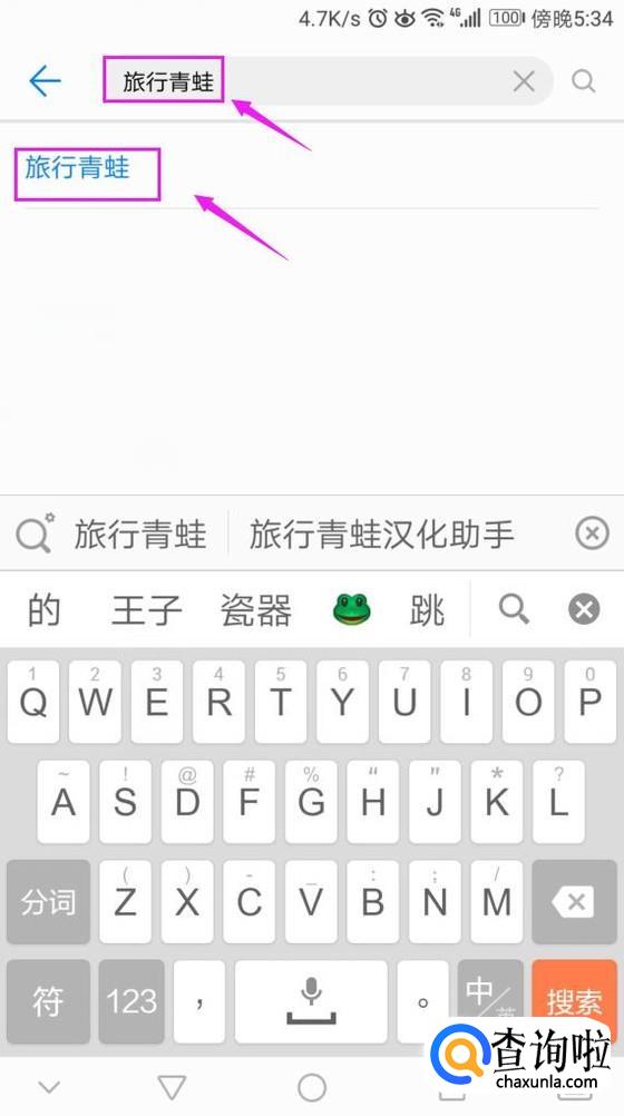 在搜索栏中输入“旅行青蛙”,点击自动出现的那个蓝色字体的,如图所示。