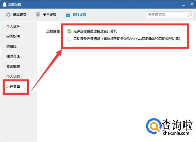 在权限管理页面,点击“远程桌面”,然后在“允许远程桌面连接这台计算机”前面的方框打勾即可解决QQ不能远程控制的问题,如图所示。