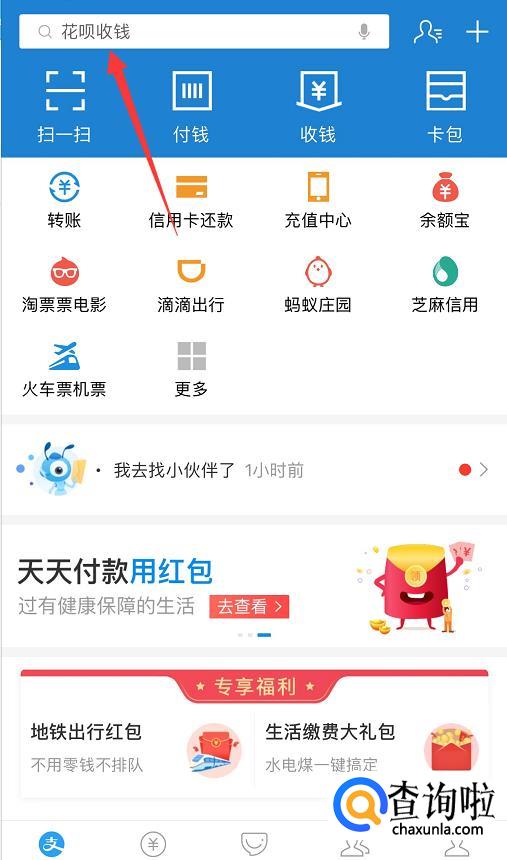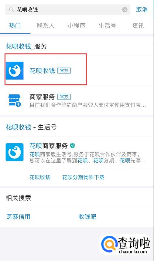 在主页面搜索【花呗收钱】,如图所示;