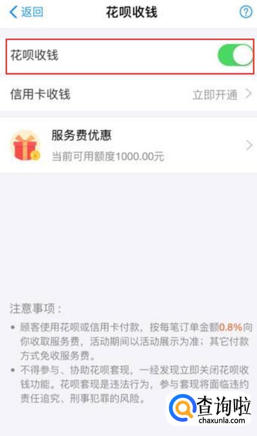 点击花呗收钱后面的按钮就可以开启,需要注意的是顾客使用花呗收钱或者信用卡支付时,每笔会扣除0.8%的服务费,如下图所示;