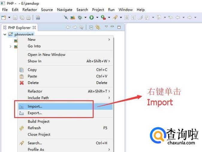 然后我们回到Zend Studio主界面,右键单击刚才创建的项目,选择Import选项,如下图所示