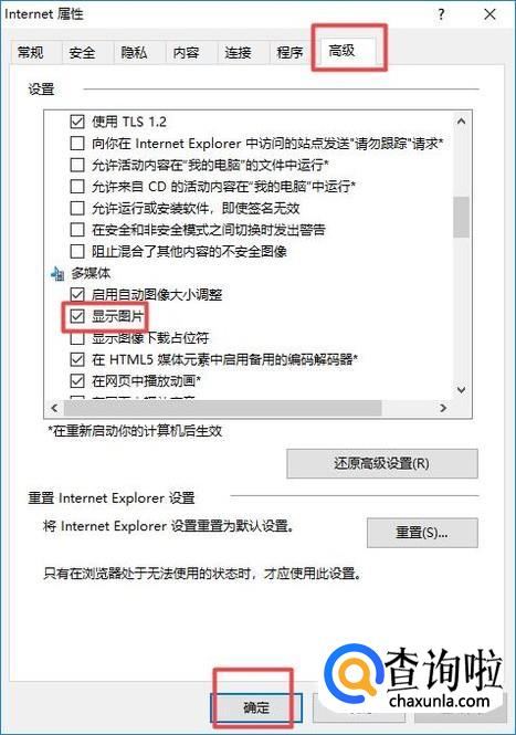 弹出的界面,我们点击高级,然后将显示图片勾选上,之后点击确定就可以了。还是比较简单的,相信大家现在都学会了。