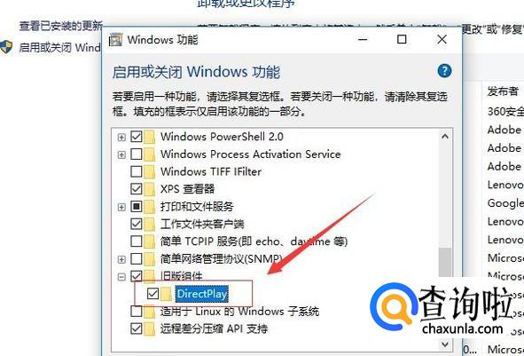 在程序和功能里面,我们找到启用或关闭windows功能并点击它。接着我们找到旧版组件里面的DirectPlay,勾选然后点击确定。