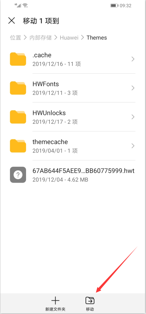 4、在Themes文件夹内,点击下方的移动,将.hwt文件移动到该文本夹内