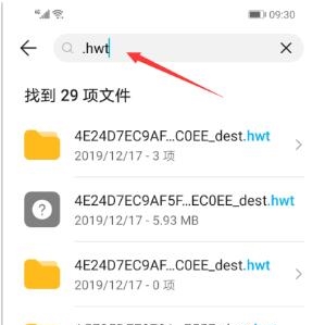 1、打开文件管理,点击内部存储,搜索图标,输入.hwt,在搜索结果中可以看到所有.hwt文件
