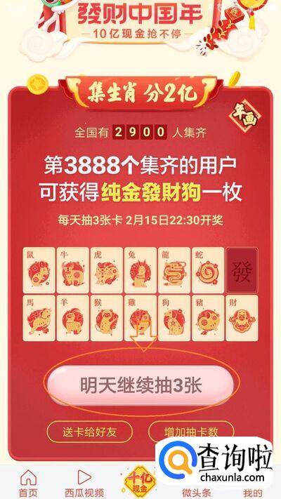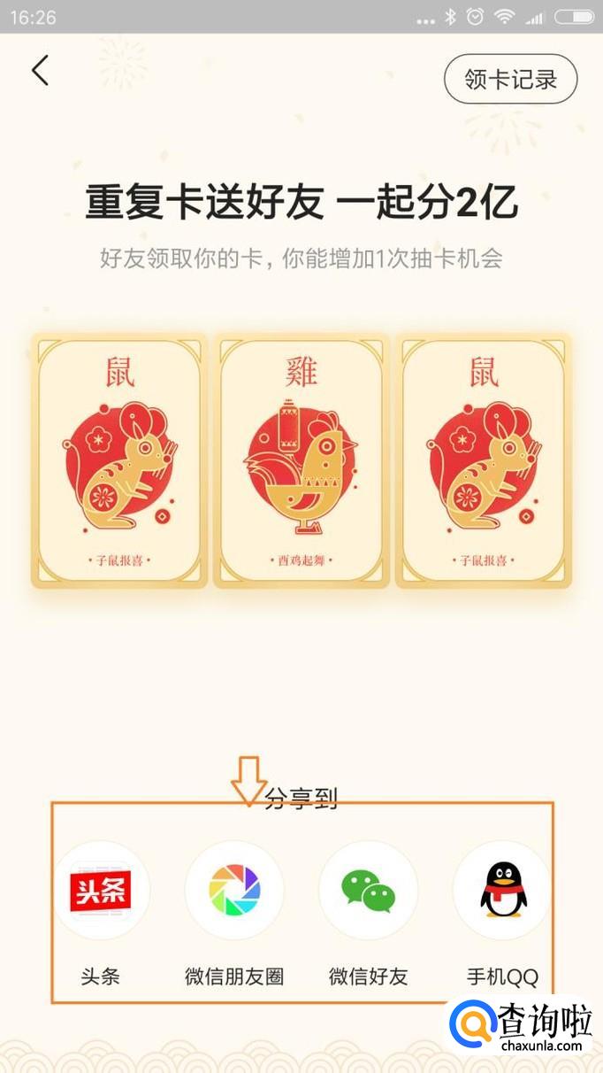 如果自己有重复的生肖卡,也可以分享给朋友,当然,如果朋友分享他的生肖卡的话,也可以从朋友那里领自己没有的生肖卡,这样方便快速集齐生肖卡。