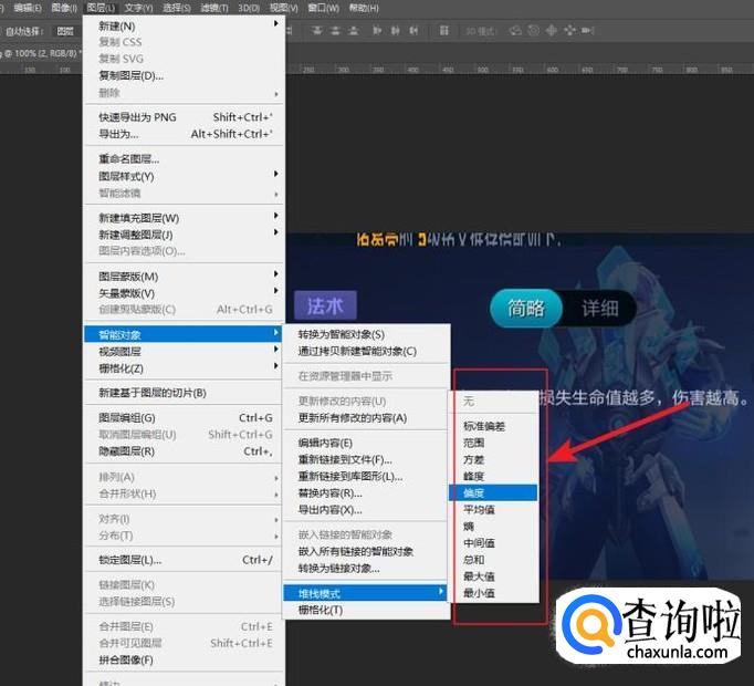 最后一步,图层-智能对象-堆栈,会发现其中有很多操作,这些操作是面向智能对象中的栅格化图层,可以尝试一下,会发现图像出现了变化。