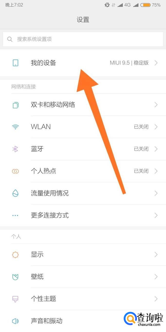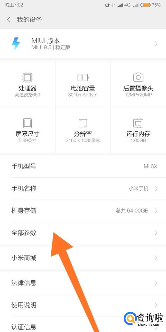 首先进入手机设置,点击进入“我的设备”里面的“全部参数”。