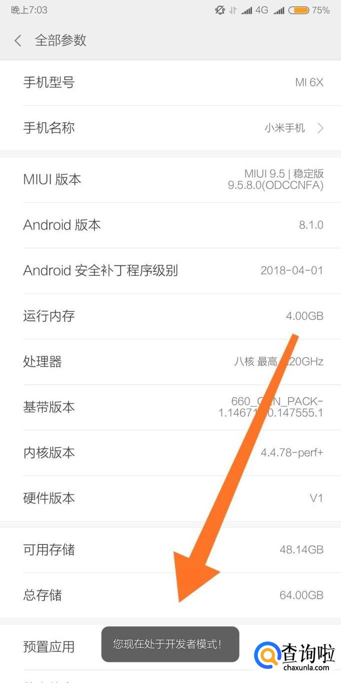 然后连续点击MIUI版本号,直到手机提示已进入开发者模式。