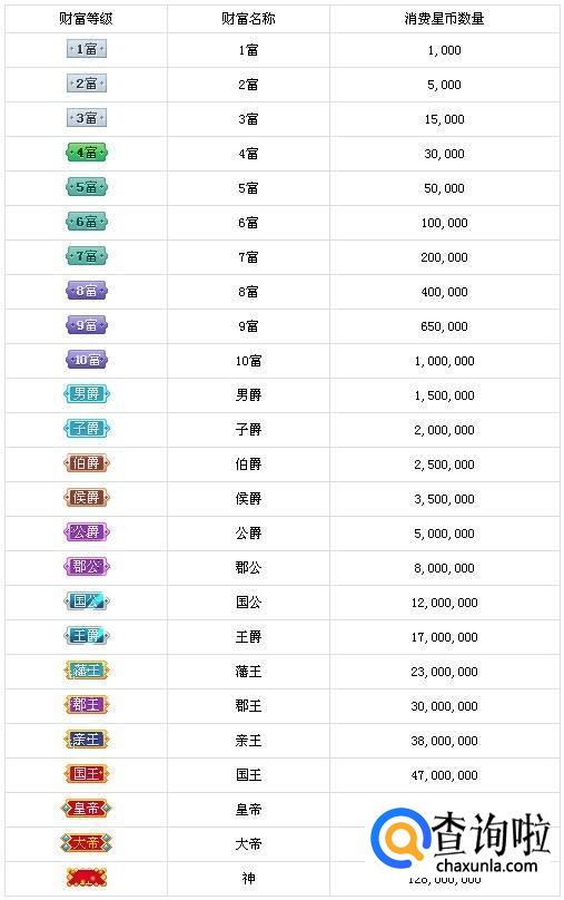 最高等级“神”的级别,所需星币为128000000,也就是RMB1280000,RMB128万。吓我一跳。有钱也不是这样花的,应当合理消费。