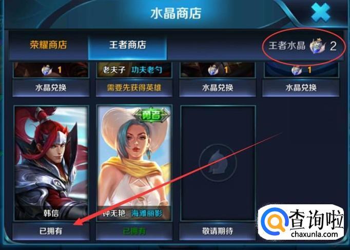 进入之后,通过钻石抽取王者水晶即可使用王者水晶兑换英雄韩信,如图所示。