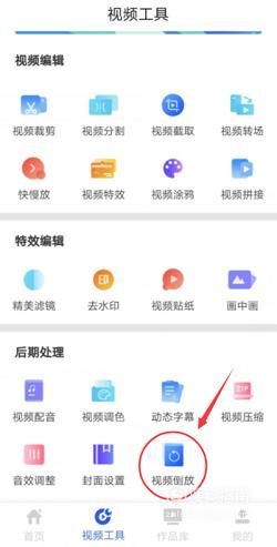 在视频工具页面的后期处理模块中,找到“视频倒放”功能,并点击进入视频导入页面。