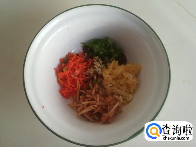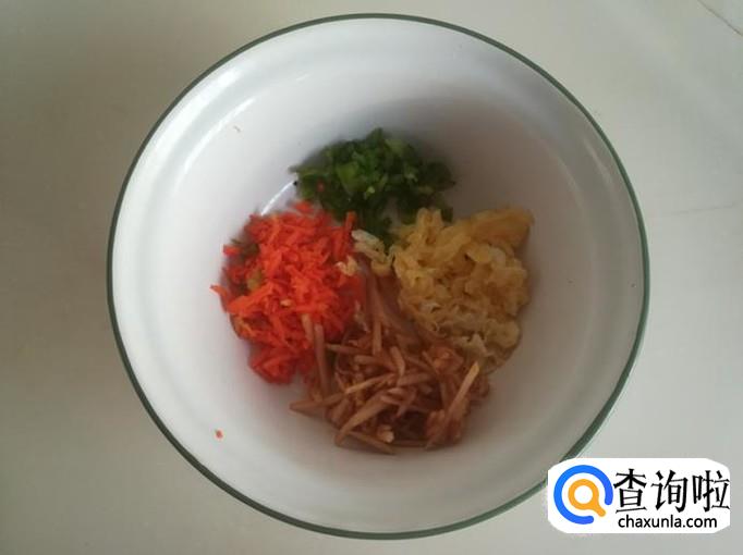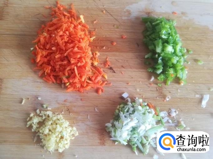 把胡萝卜、青椒、葱、姜全部切成碎末。
