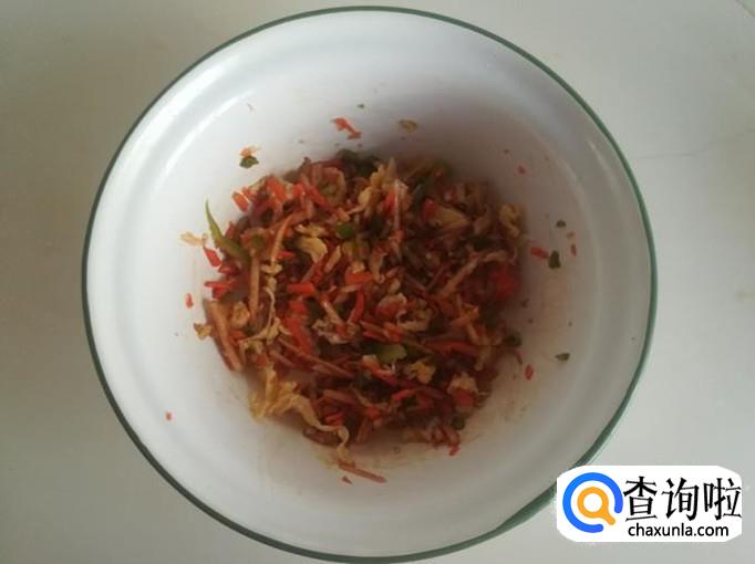 把擦好的苹果丝,切碎的胡萝卜,青椒,鸡蛋全部放入一个小盆里。