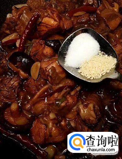炖至汤汁浓稠,将要出锅时,我们加入适量的盐,鸡精,青红辣椒,翻炒均匀