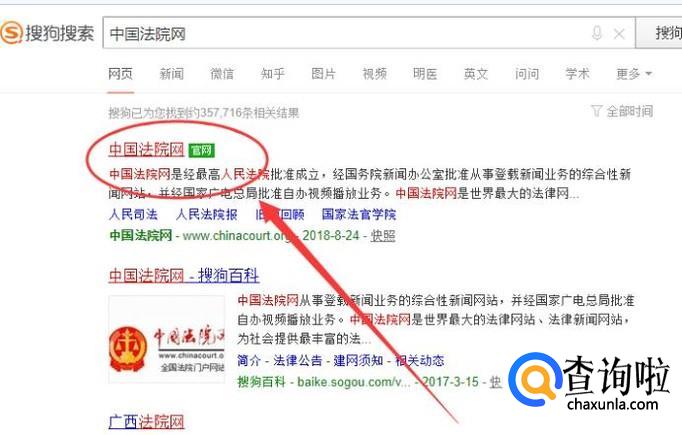 打开电脑,进入搜狗浏览器,搜索“中国法院网”,点击并进入,如图所示。