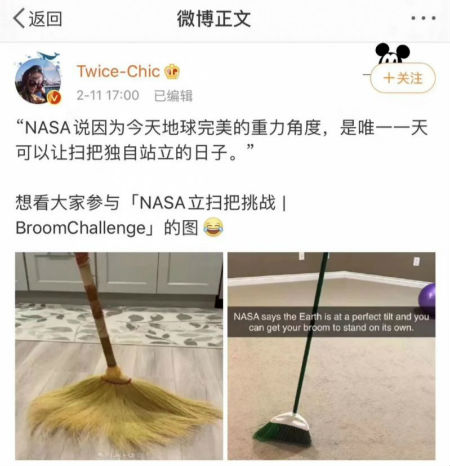 于是很多网友就在朋友圈和微博发起所谓的NASA立扫把挑战。