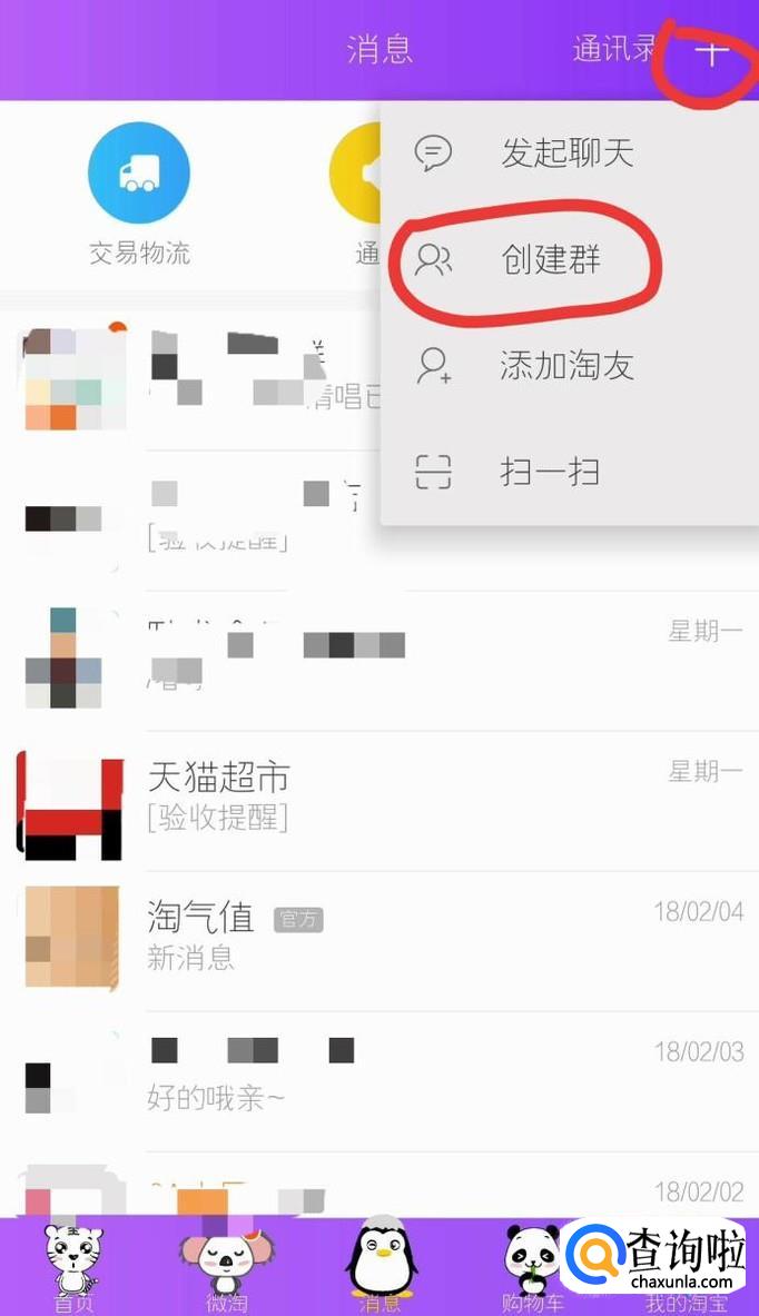 点击消息页面上面的+号,就会出现创建群的字样,我们点击进入下一个页面。
