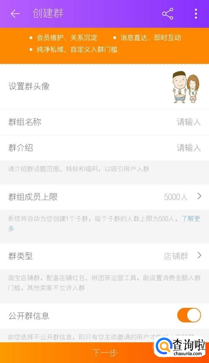 可以开始创建群了,填写好群的名称,简介这些内容,点击下一步。