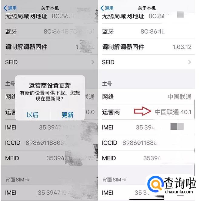 将系统升级到iOS13.3正式版之后,进入 设置 -> 通用 -> 关于本机,之后会弹出更新运营商文件,点“更新”,升级到“中国联通40.1”,如下图所示。