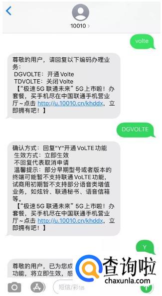 然后给联通发送开通Volte短信(给10010发送volte),根据提示开通,如下图所示。