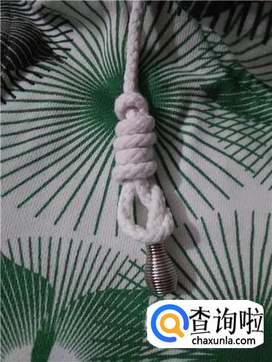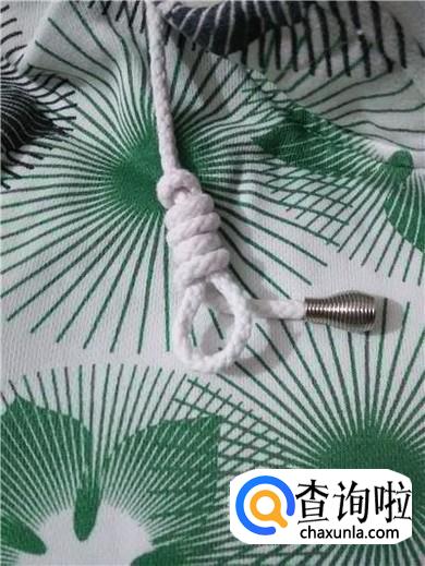 将绳头从下方的套中穿下去,使套别住绳头上的金属疙瘩,绳子就绑好了。