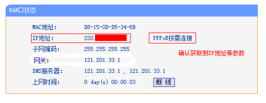 设置完成后,进入路由器管理界面,点击运行状态,查看WAN口状态,如下图框内IP地址不为0.0.0.0,则表示设置成功。