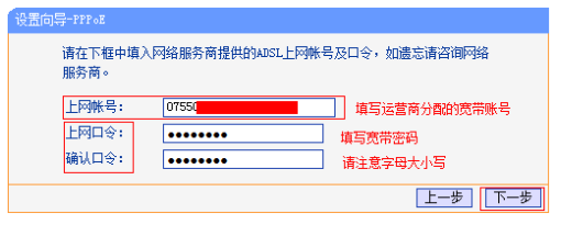 在对应设置框填入运营商提供的宽带账号和密码,并确定该账号密码输入正确。