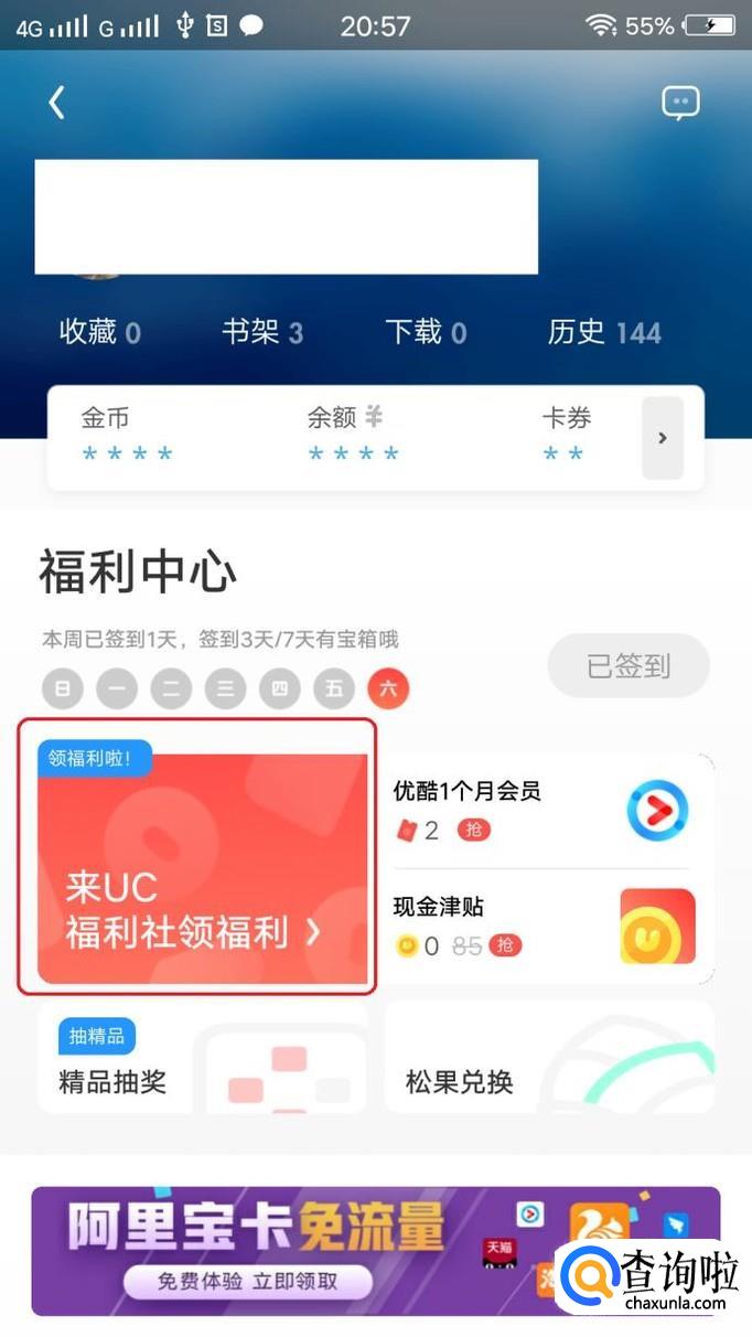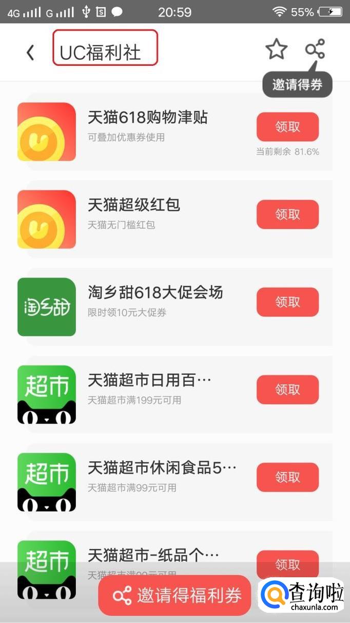 在个人界面中,点击“来UC福利社领福利”,就进入“福利社”了,在里面可以领取到很多天猫淘宝的优惠券。