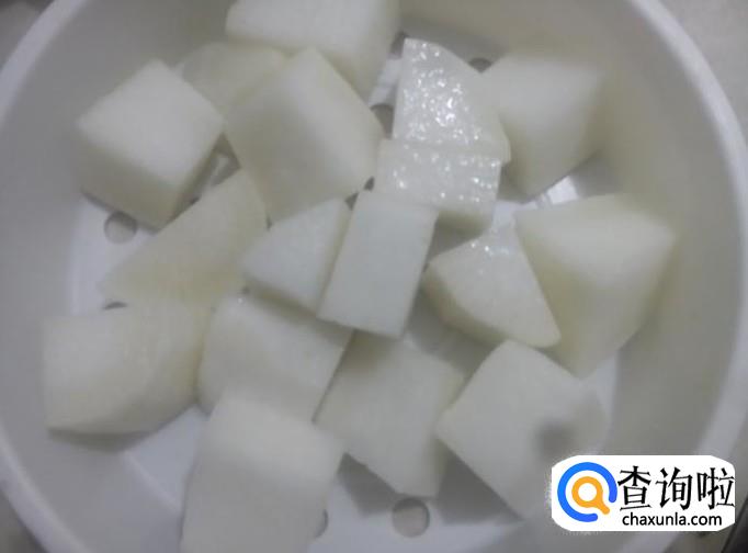 白萝卜去皮切成小方块。