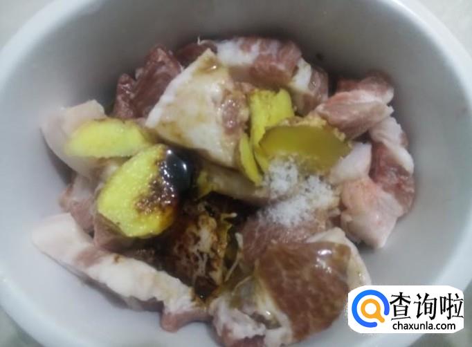 五花肉切成厚片,加适量的盐、姜片、1勺生抽、1勺料酒、小半勺老抽腌制十几分钟。