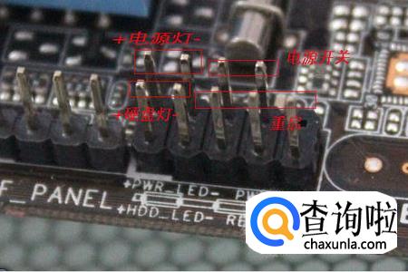 插入的时候需要注意每个接口对应的插孔,开关机跳线,主板上面已有明确的标识,根据标识插入,如果还是不清楚,这里我们用4句话来概括9针定义开关/复位/电源灯/硬盘灯位置:缺针旁边插电源,电源对面插复位,电源旁边插电源灯,负极靠近电源跳线,复位旁边插硬盘灯,负极靠近复位跳线,如下图所示;
