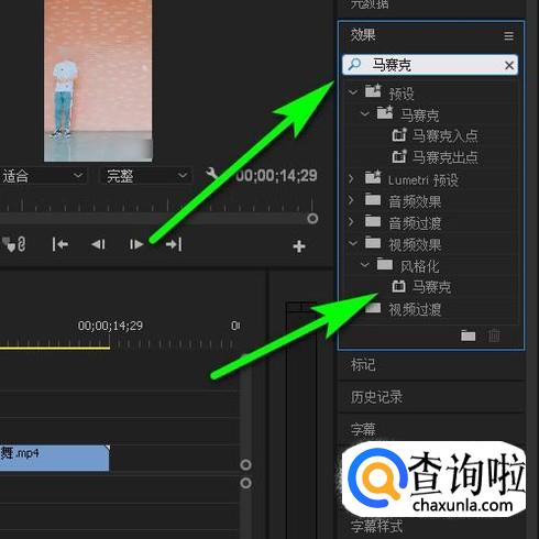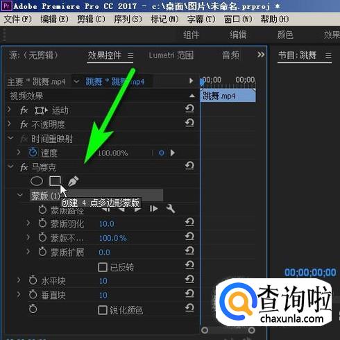 把马赛克拖给视频,再看效果控件面板这里,创建矩形蒙版路径。