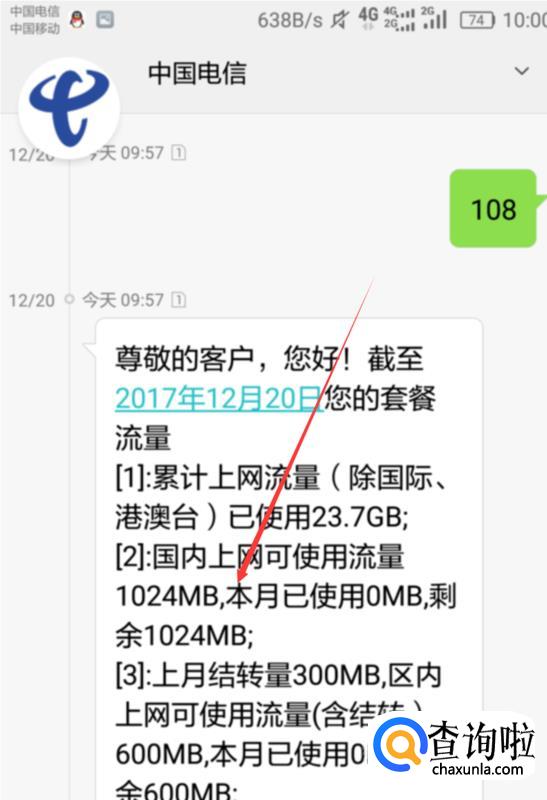 给“10001”发送内容为“108”的短信,就可以查询到了。