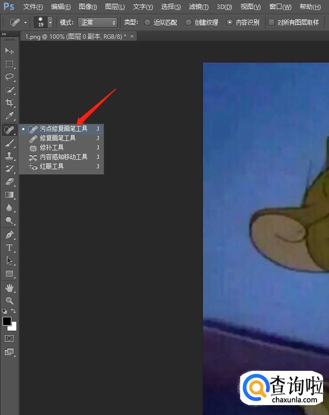 选择左边箭头所指的【污点修复画笔工具】: