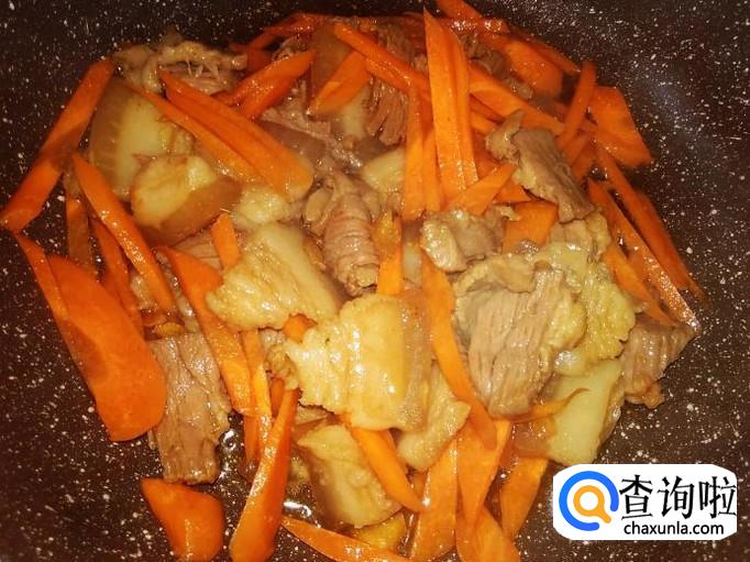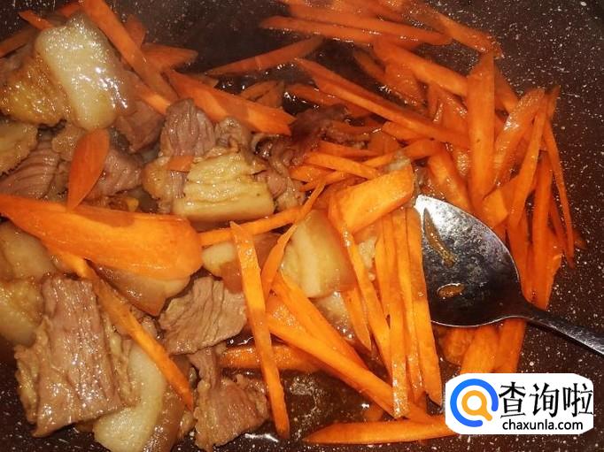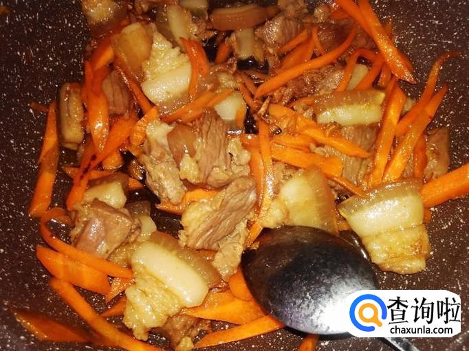 放红萝卜丝进去煸炒至软。【红萝卜不用放盐了,因为猪肉味料已经很浓】