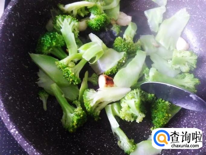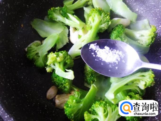 西兰花下锅,加适量的盐翻炒1分钟左右。