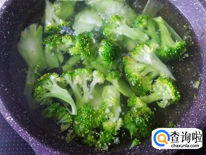 锅里装适量的水煮沸,放西兰花进去灼1分钟左右,捞上来放置冷水盘里过一下水。