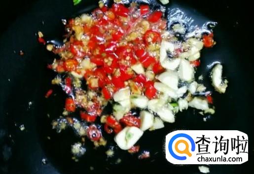 锅内倒油加热,然后放入葱蒜红椒爆香。注意此时火不要太大,以免油起火。
